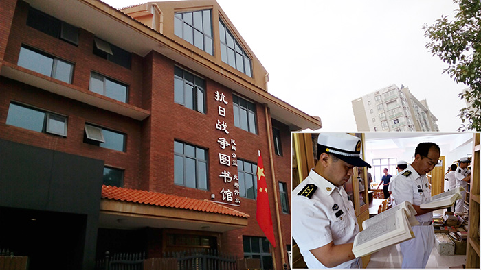 湖南炎德文化實(shí)業(yè)有限何譽(yù)軍創(chuàng)建的抗日戰(zhàn)爭(zhēng)圖書(shū)館。右下圖為海軍某部官兵到抗日戰(zhàn)爭(zhēng)圖書(shū)館參觀學(xué)習(xí)。