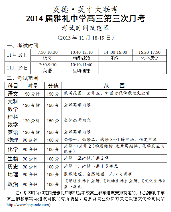 上一篇:炎德英才大聯(lián)考雅禮中學2014屆高三第2次月考考試時間和范圍(2013.10.21-22)