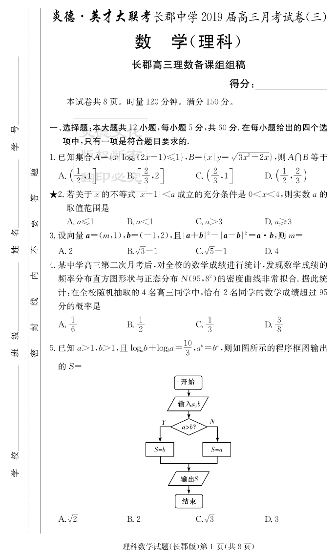 【理數(shù)】炎德英才大聯(lián)考2019長郡中學(xué)高三3次月考