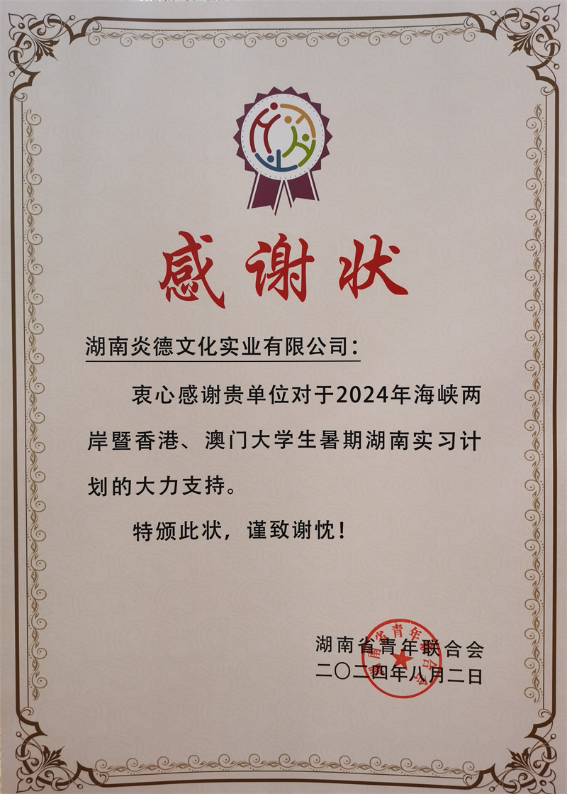 湖南炎德文化實(shí)業(yè)有限公司獲2024年港澳臺(tái)大學(xué)生暑期湖南實(shí)習(xí)計(jì)劃“感謝狀”